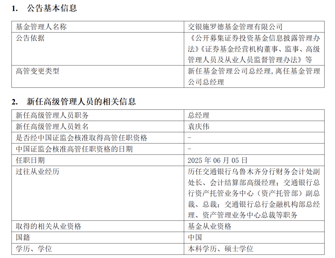 简历资料显示,袁庆伟出自交银施罗德基金的大股东交通银行,曾在交通银行担任多个要职,包括乌鲁木齐分行财务会计处副处长、会计结算部高级经理,以及总行资产托管业务中心、金融机构部、资产管理业务中心等部门的副总裁、总裁等职务。